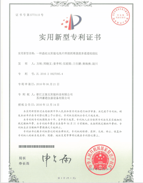 最后小编来个杀手锏、谦通和正泰太阳能一起申请的实用新型专利证书: