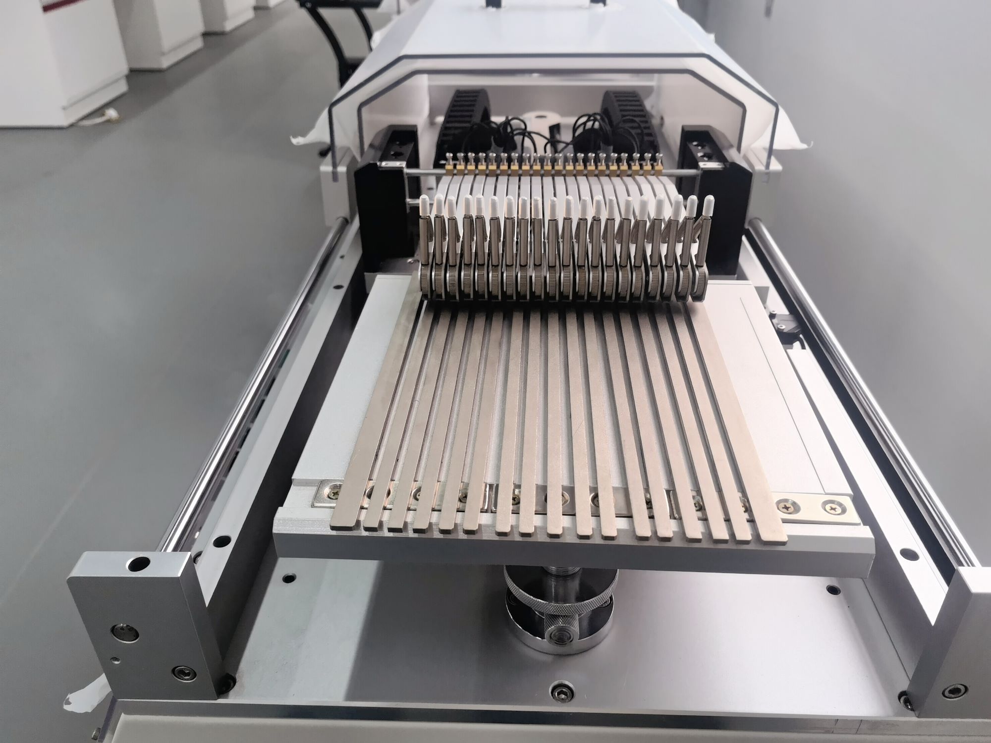3、机器只需单人既可操作,十六条栅带可同时拉伸,一片电池片单面只需<4分钟时间即可测试完成;